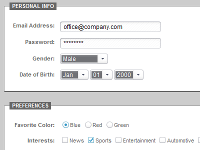 Niceforms parses the DOM tree, gets all the input fields, hides them, and positions their new graphical appearance in place. All this is done while preserving the date transfer and selection features of the regular form. Everything is done via javascript.