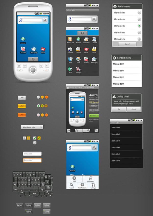Google Android GUI PSD inspired by teehan+lax’s iPhone PSD, here are the basic GUI elements, built using vectors to scale, for the Android.